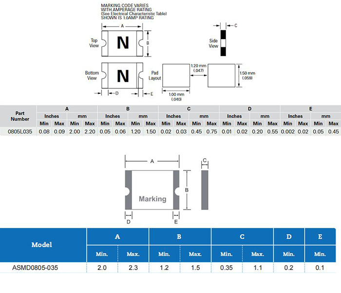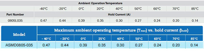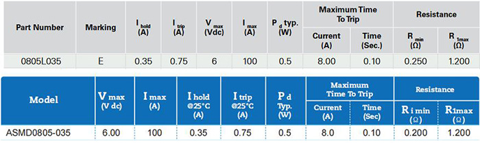 深圳集電通成熟的產品線貼片自恢復保險絲ASMD0805-035可替換Littelfuse力特品牌的0805L035,從電氣參數和指標對比:
